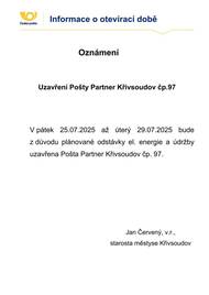 V pátek 25.07. 2025 až úterý 29.07.2025 bude uzavřena Pošta Partner Křivsoudov čp. 97 z důvodu plánované odstávky el. energie a údržby.