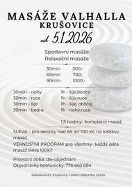 Zveme všechny do nově otevřeného masérského salónu Valhalla v 1.patře obecního úřadu Krušovice.