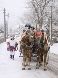 Průvod masek a maškar obcí doprovázený muzikou folklórního souboru Jizera.