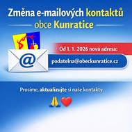 Od 1. ledna 2026 přechází Obec Kunratice na nové oficiální e-mailové adresy s vlastní registrovanou doménou obeckunratice.cz. Tímto krokem postupně ukončujeme využívání e-mailových schránek zřízených na serveru Seznam.cz.
