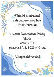 Zveme Vás na Vánoční pozdravení s cimbálovou muzikou Pavla Kordíka v kostele Nanebevzetí Panny Marie v Kvasicích v sobotu 27.12.2025 v 16,00 hodin. Vstupné dobrovolné.