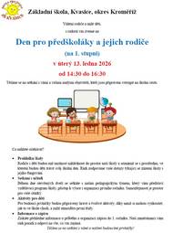 Vážení rodiče a milé děti, s radostí vás zveme na Den pro předškoláky a jejich rodiče v úterý 13.1.2026 od 14,30 do 16,30 hodin. Těšíme se na setkání s vámi a vašimi malými objeviteli, kteří jsou připraveni vstoupit na školní cestu.