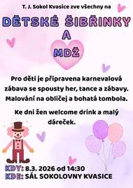 T.J. Sokol Kvasice zve všechny na dětské šibřinky, které se uskuteční v neděli 8.března 2026 od 14,30 hodin v sále sokolovny v Kvasicích.