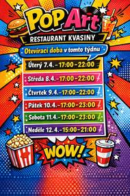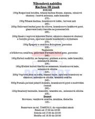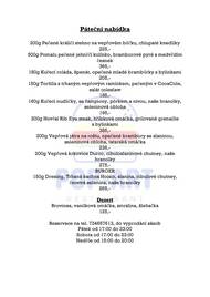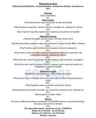 menu 17.-19.4.2026 Akce na víkend 🦆KACHNA 3x JINAK🦆 Pátek od 17:00 Sobota od 17:00 K tomu Vám naservírujeme hokojevou baráž Verva Litvínov vs Dukla Jihlava Neděle od 17:00 Finále extraligy Dynamo Pardubice vs Třinec Těšíme se na Vaší návštěvu Rezervace na tel 734657613