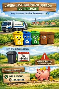 Od 1. ledna 2026 došlo v obci Kyselka ke změně dodavatele svozu komunálního i tříděného odpadu. Novým dodavatelem je společnost Marius Pedersen a.s., a to na základě hromadného výběrového řízení „Svoz a využití či odstranění odpadu pro vybrané obce Sdružení Krušné hory – západ“. Do projektu se zapojilo celkem 11 obcí a jeho hlavním cílem je snížení nákladů a sjednocení systému. V souvislosti s touto změnou byly postupně odvezeny velké nádoby na tříděný odpad (ve vlastnictví dosavadního dodavatele) ze sběrných hnízd a jsou postupně nahrazovány novými. Bohužel přechod neprobíhá zcela podle plánu – dodávka nových nádob je aktuálně ve skluzu a obec se může dočasně ocitnout bez těchto nádob. Víme, že je to nepříjemné. S novým dodavatelem jsme v úzkém kontaktu a byli jsme ubezpečeni, že se situace v průběhu příštího týdne vyřeší. Děkujeme všem občanům za trpělivost a pochopení – situaci aktivně řešíme s dodavatelem služeb. Co se mění? Podstatnou změnou je četnost svozu směsného komunálního odpadu, který bude svážen nejčastěji 1× za 14 dní. Svoz 1× týdně již není možný. Pro ty, kterých se tato změna týká, to samozřejmě znamená úměrné snížení poplatku za sběr komunálního odpadu. Dotazy a informace V případě dotazů, nejasností nebo individuálních požadavků se obracejte na sekretariát Obce Kyselka: 724 327 548. Děkujeme za spolupráci a ohleduplnost při třídění odpadu.