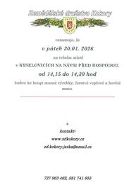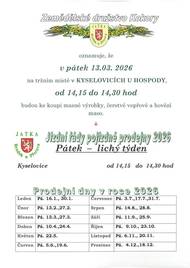 Drůbežárna Prace bude v úterý 3. 2. 2026 v 9.30 na návsi před hospodou prodávat: mladé kuřice, krmivo pro drůbež a králíky, vitamínové doplňky a dále budou vykupovat králičí kožky za 10 Kč
