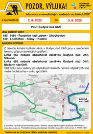 Z důvodu konání pouťě v Budyni nad Ohří jsou ve dnech 2.-3.8.2025 přijata opatření v autobusové dopravě linky 650 a 685, viz příloha.