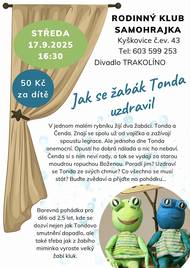 Klub Samohrajka zve všechny na pohádku "Jak se žabák Tonda uzdravil" ve středu 17.9.2025 od 16:30.