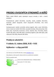 Školní statek Mělník nabízí prodej ovocných stromků a keřů. Prodej se uskuteční v sobotu 11.4.2026 v 9:25-9:35 v Kyškovicích v zatáčce u ČOV. Více info v příloze.
