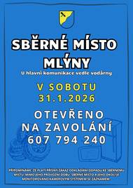 Vážení občané, V sobotu 31.1.2026 bude sběrné místo Mlýny otevřeno na zavolání, ve standartním čase 9-12 hod.