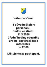 Vážení občané, Z důvodu školení personálu, budou ve středu 11.3.2026 úřední hodiny obecního úřadu i otevírací doba infocentra do 12:00. Děkujeme za pochopení.