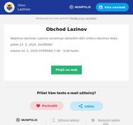 Nájemce obchodu Lazinov oznamuje občanům dílčí změnu otevírací doby: pátek 23. 5. 2025 ZAVŘENO sobota 24. 5. 2025 OTEŘENO 7.00 - 9.00 hodin