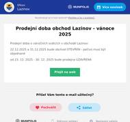 Oznamujeme občanům, že dne 19. 12. 2025 NEBUDOU úřední hodiny pro veřejnost z důvodu čerpání dovolené. Ve dnech od 23. 12. 2025 - 5. 1. 2026 bude obecní úřad Lazinov UZAVŘEN. Dne 22. 12. 2025 bude otevřena kancelář obecního úřadu Lazinov pro všechny občany v době od 8.00 - 14.00 hodiny.