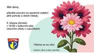 Vážení občané, vyslechněte si krátké hlášení místního rozhlasu. Obec Lazníčky a kulturní výbor Lazníčky si vás dovolují srdečně pozvat na přátelské posezení při příležitosti mezinárodního dne žen. Setkání se uskuteční zítra, ve čtvrtek 5. března v kulturním sále obecního úřadu v Lazníčkách od 18 hodin. Přijďte si společně užít příjemný podvečer v milé společnosti. Těšíme se na vás.