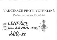 Očkování psů proti vzteklině proběhne v sobotu 02.05.2026 od 13:30 hod. před obecním úřadem, cena 200,- Kč. Psa s náhubkem přivede majitel starší 18 let, očkovací průkaz s sebou.