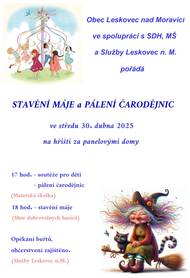 STAVĚNÍ MÁJE a PÁLENÍ ČARODĚJNIC Obec Leskovec nad Moravicí ve spolupráci s SDH, MŠ a Služby Leskovec n. M. pořádá STAVĚNÍ MÁJE a PÁLENÍ ČARODĚJNIC, která se uskuteční ve středu 30. dubna 2025 na hřišti za panelovými domy. Těšit se můžete na soutěže pro děti, opékání buřtů a další občerstvení. https://www.leskovecnadmoravici.eu/akce-a-volny-cas/kalendar-akci/staveni-maje-a-paleni-carodejnic-672_361cs.html