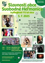 Obec Svobodné Heřmanice pořádá slavnosti k příležitosti 775 let obce již tuto sobotu 5. července 2025. Připravila bohatý hudební program, občerstvení a atrakce pro děti. Vstupné je dobrovolné a jeho výtěžek bude věnován na podporu Oddělení dětské neurologie ve Fakultní nemocnici v Ostravě.