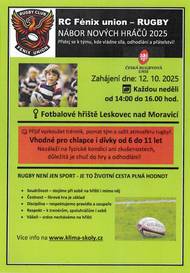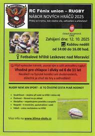 RC Fénix union vyhlašuje nábor nových hráčů pro sezonu 2025, který začíná v sobotu 12. října 2025. Přijďte se seznámit s hodnotami, které rugby přináší, a zapojte se do tréninků, které probíhají každou neděli od 14:00 do 16:00 hodin na fotbalovém hřišti v Leskovci nad Moravicí. https://www.leskovecnadmoravici.eu/akce-a-volny-cas/aktuality/nabor-novych-hracu-do-rugby-722cs.html