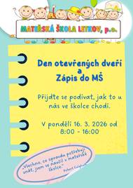 V pondělí 16. 3. 2026 budou probíhat zápisy do MŠ Letkov. V tento den bude školka otevřená i pro veřejnost. Podrobné informace naleznete na: www.msletkov.cz