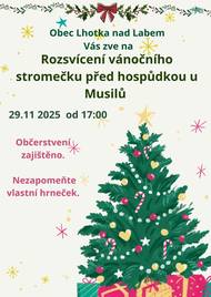 ROZSVÍCENÍ VÁNOČNÍHO STROMEČKU Lhotka nad Labem před hospůdkou u Musilů 29.11.2025 od 17:00 hod. Občerstvení zajištěno. Nezapomeňte vlastní hrneček!
