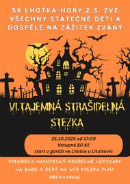 Odvážlivci, zbystřete! V sobotu 25. října od 17:00 se naše obec promění v říši, kde strašidla, bubáci a jiné potvory číhají za každým rohem. Vstupné: 80 Kč – za to každý malý hrdina dostane kartičku a kouzelný pytlíček, do kterého si bude sbírat sladké i hrůzostrašné poklady.