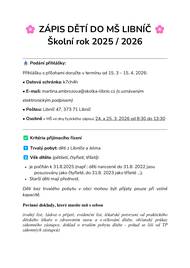 Školní rok 2025 / 2026 📥 Podání přihlášky: Přihlášku s přílohami doručte v termínu od 15. 3 – 15. 4. 2026: • Datová schránka: k7ch4h • E-mail: martina.ambrozova@skolka-libnic.cz (s uznávaným elektronickým podpisem) • Poštou: Libníč 47, 373 71 Libníč • Osobně v MŠ ve dny fyzického zápisu: 24. a 25. 3. 2026 od 8:30 do 13:30 ✅ Kritéria přijímacího řízení 1️⃣ Trvalý pobyt: děti z Libníče a Jelma 2️⃣ Věk dítěte (pětiletí, čtyřletí, tříletí): · je počítán k 31.8.2025 (např.: děti narozené do 31.8. 2022 jsou posuzovány jako čtyřleté, do 31.8. 2023 jako tříleté ...). · Starší děti mají přednost. Děti bez trvalého pobytu v obci mohou být přijaty pouze při volné kapacitě. Povinné doklady, které musíte mít s sebou (rodný list; žádost o přijetí; evidenční list, lékařské potvrzení od praktického dětského lékaře o zdravotním stavu a o očkování dítěte, občanský průkaz zákonného zástupce, doklad o trvalém pobytu dítěte - pokud se liší od TP zákonných zástupců)