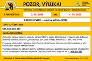 Vážení občané, z důvodu opravy povrchu vozovky silnice II/237 v úseku Libochovice – Klapý bude dočasně zrušena obsluha zastávky „Libochovice, žel. zast. město“ linkami 637, 665, 685 a 689. Pro spoje obsluhující zastávku „Libochovice, škola“ bude zřízena náhradní zastávka v ulici Vrchlického naproti základní škole. V případě dotazů na aktuální polohu autobusů nebo pro zajištění garantovaných přestupních vazeb kontaktujte Centrální dispečink Dopravy Ústeckého kraje na tel. č. 475 657 657.