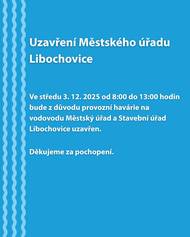 Vážení občané, ve středu 3. 12. 2025 od 8:00 do 13:00 hodin bude z důvodu provozní havárie na vodovodu Městský úřad a Stavební úřad Libochovice uzavřen. Děkujeme za pochopení.