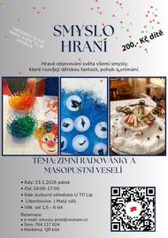Přinášíme vám nabídku dalšího Smyslohraní pro děti od 1,5 do 6 let, tentokrát na téma zimní radovánky a masopustní veselí. Přijďte si s dětmi společně užít hravé objevování světa všemi smysly. Čeká vás kreativní smyslová herna, která rozvíjí dětskou fantazii, pohyb i vnímání. 📅 Kdy: 23. 1. 2026 🕑Čas: 16:00 – 17:00 📍 Kde: Kulturní středisko U Tří lip, Libochovice - malý sál Cena: 200 Kč / dítě ℹ️ Kapacita je omezená - nutná rezervace