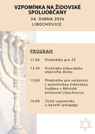 Zveme vás na vzpomínkové odpoledne věnované židovským spoluobčanům, které se uskuteční v pátek 24. dubna 2026. Součástí programu bude přednáška emeritního kantora Michala Foršta s autentickou židovskou hudbou v Městské knihovně Libochovice, komentovaná prohlídka židovského obecního domu i tichá vzpomínka u bývalé synagogy. Přijďte si připomenout minulost a objevit kulturní odkaz, který i dnes stojí za to poznávat.