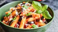Jednoduché, ale výrazné jídlo Pasta alla Norma plné chutí pochází z italské Sicílie. Obvykle se posype sýrem ricotta salata, použít ale můžete i jiný tvrdý sýr typu feta.