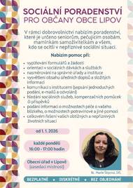 Od 1. ledna 2026 začne v obci Lipov fungovat bezplatné sociální poradenství, které je určeno seniorům, pečujícím osobám a maminkám samoživitelkám a všem, kdo se ocitli v tíživé sociální situaci. Poradenství probíhá každé pondělí od 16:00 do 17:00 hodin v zasedací místnosti obecního úřadu.
