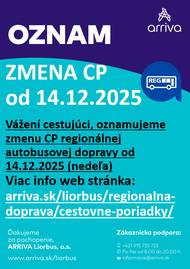Vážení cestujúci, oznamujeme zmenu cestovného poriadku regionálnej autobusovej dopravy, ktorá nadobudne účinnosť od 14. decembra 2025. Viac informácií o zmenách nájdete na stránke arriva.sk/liorbus/regionalna-doprava/cestovne-poriadky.