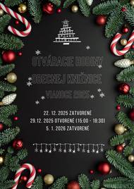 22.12.2025 - ZATVORENÉ 29.12.2025 - OTVORENÉ 15:00 - 18:30 hod. 05.01.2026 - ZATVORENÉ