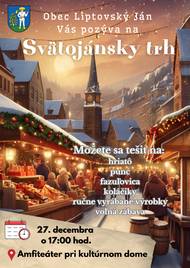 Pozývame Vás na Svätojánsky trh, ktorý sa uskutoční 27. decembra 2025 o 17:00 hod. v amfiteátri kultúrneho domu v Liptovskom Jáne. Všetci ste srdečne vítaní, aby sme si spoločne vychutnali vianočnú atmosféru a chuť a vôňu vianočných dobrôt!