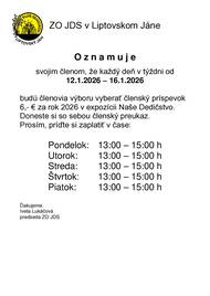 O z n a m u j e svojim členom, že každý deň v týždni od 12.1.2026 – 16.1.2026 budú členovia výboru vyberať členský príspevok 6,- € za rok 2026 v expozícii Naše Dedičstvo. Doneste si so sebou členský preukaz. Prosím, príďte si zaplatiť v čase: Pondelok: 13:00 – 15:00 h Utorok: 13:00 – 15:00 h Streda: 13:00 – 15:00 h Štvrtok: 13:00 – 15:00 h Piatok: 13:00 – 15:00 h Ďakujeme. Iveta Lukáčová predseda ZO JDS