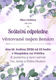 Obec Litohlavy Vás srdečně zve na sváteční odpoledne věnované nejen ženám, uskuteční se 16. května 2026 od 15 hodin v Hospůdce na Vršíčku. K poslechu a tanci zahrají Iva, Jarda a Eliška Mužovi.