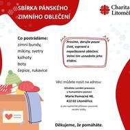 Litoměřice – Středisko sociální prevence a humanitární pomoci, které provozuje Charita Litoměřice, hlásí velký nedostatek pánského zimního oblečení. Pokud můžete čímkoliv pomoci, lidé bez domova Vám budou velmi vděční. Potřeba jsou hlavně mikiny, svetry, zimní bundy, kalhoty, boty, čepice a rukavice. Vyprané a nepoškozené oblečení prosím noste přímo na Středisko sociální prevence a humanitární pomoci,