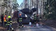 Těžká technika si ustlala na boku. Harvestor se převrátil v lese na Brněnsku