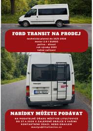 STK 25/5-2026, motor 2.0 l EURO3, palivo diesel, rok výroby 2001, tažné zařízení. Nabídky můžete podávat na podatelně úřadu městyse Litultovice do 27.4.2026 v zalepené obálce s vašimi kontaktními údaji nebo emailem městys@litultovice.cz