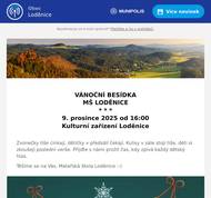 VÁNOČNÍ BESÍDKA MŠ LODĚNICE * 9. prosince 2025 od 16:00 Kulturní zařízení Loděnice Zvonečky tiše cinkají, dětičky v předsálí čekají. Kulisy v sále stojí tiše, děti si zkoušejí poslední verše. Přijďte s námi prožít čas, kdy zpívá každý dětský hlas. Těšíme se na Vás, Mateřská škola Loděnice :-)