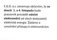 Dobrý den, společnost E.G.D. s.r.o. oznamuje občanům, že ve dnech 4. a 5. listopadu bude pracovník provádět odečet elektroměrů od všech dodavatelů elektrické energie. Žádáme o umožnění přístupu k elektroměrům. Děkujeme Hezký de