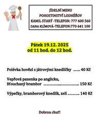 Pohostinství Lodhéřov nabízí v pátek 12.9.2025 od 11.00 hod dršťkovou polévku 50 kč, kuřecí stripsy s barmborovou kaší 140 kč, vepřové výpečky, zelí a houskový knedlík 140 kč.