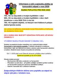 Platnost známky na popelnici je do 31.3.2026. Info. o úhradách za odpady bude rozesílána. Splatnost poplatku za odpady pro rok 2026 bude k 30.4.2026. Od 1.1.26 NOVĚ DO ŽLUTÝCH KONTEJNERŮ: PLASTY+KOVOVÉ OBALY+NÁPOJOVÉ KARTONY.