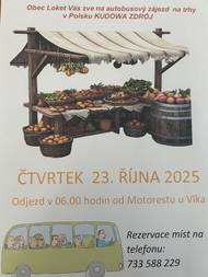 Obec Loket Vás zve na autobusový zájezd na trhy v Polsku KUDOWA ZDRÓJ ve čtvrtek 23. ŘÍJNA 2025. Odjezd v 06.00 hodin od Motorestu u Vlka. Rezervace míst na telefonu: 733 588 229. Zuzana Černá