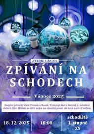Srdečně zveme všechny příznivce našeho tradičního vánočního vystoupení pěveckých sborů. Přijďte si užít vánoční atmosféru a společné zpívání s dětmi 18. prosince 2025 od 18:00 v prostorách 1. st. ZŠ.