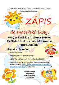 Mateřská škola Lomnice nad Lužnicí srdečně zve všechny děti na zápis do mateřské školy, který se bude konat ve dnech 3. a 4. března 2026. Více informací na přiloženém plakátu.