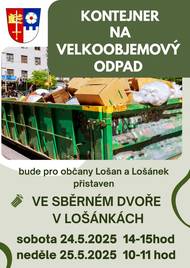 Tuto sobou od 14 do 15 hodin a v neděli od 10 do 11 hodin, je možné využít kontejner na velkoobjemový odpad. Kontejner je přistavěn ve sběrném dvoře Lošánky. Zde je možné vyhodit starý nábytek, koberce, matrace a další rozměrný komunální odpad, který nepodléhá třídění.