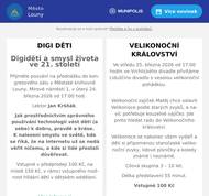 Ve čtvrtek 9. dubna 2026 bude probíhat blokové čištění v ulicích: Husova, Čs. armády, Dukelská, Tylova, Lipová, Zahradní, Vladimirská a Školní. Prosíme, abyste si včas přeparkovali své auto. Děkujeme. Plán blokového čištění naleznete zde 👉 https://1url.cz/yervD