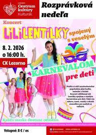 Před 1 měsícemROZPRÁVKOVÁ NEDEĽA - Koncert LILI LENTILKY spojený s veselým KARNEVALOMMilé rodinky! Zaznačte si do kalendárov februárovú ROZPRÁVKOVÚ NEDEĽU v CK Lozorno a tentoraz vás čaká: Koncert LILI LENTILKY spojený s veselým KARNEVALOM pre deti! 8.2.2025 o 16:00 hod. Centrum kultúry a vzdelávania Lozorno Príďte si užiť nezabudnuteľné popoludnie plné hudby, smiechu a farieb! Koncert obľúbenej Lili Lentilky spojíme s veselým karnevalom pre deti . Čaká vás zábava, tanec, masky a skvelá atmosféra pre malých aj veľkých . Každá maska dostane odmenu ! Vstupné: 8€/os Predaj vstupeniek na mieste pred podujatím, alebo vopred v Centre kultúry Lozorno, Zvončínska 3 (v doobedňajších hodinách).